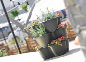 Gdy balkon jest mały, warto wybrać donice kaskadowe. To wielopoziomowe kwietniki, w których zajmując tą samą powierzchnię balkonu, możemy zaaranżować uprawę wielu roślin. Taki ogród wykonany z lekkiego polistyrenu łatwo przeniesiemy.