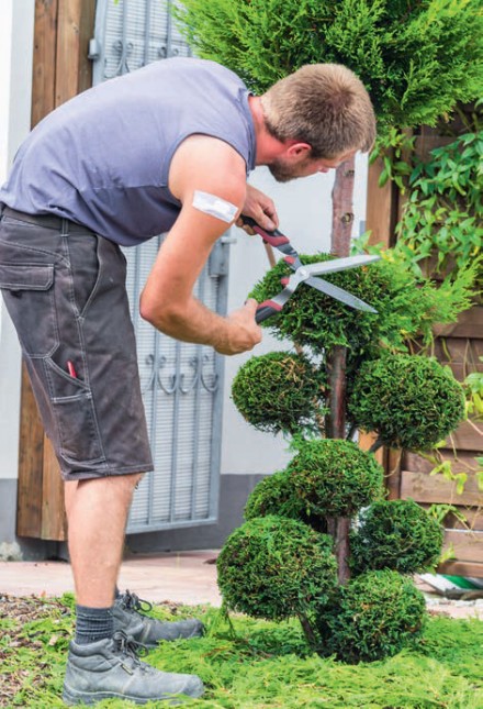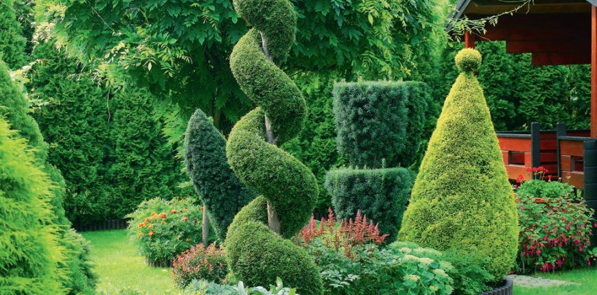 W szkółkach i sklepach ogrodniczych znajdziemy wiele odmian iglaków doskonale nadających się do nasadzeń na niewielkim terenie – szczepionych na pniu. Rośliny iglaste wyprowadzone na wiodącym pniu mają zwykle kompaktowe rozmiary z rozbudowaną koroną. Doskonale nadają się poza sadzeniem w gruncie do nasadzeń w donicach, np. na tarasie i balkonie. Zarówno rośliny iglaste wolno rosnące, jak i te szczepione na pniu bardzo dobrze znoszą przycinanie. Zielone rzeźby to niebagatelna atrakcja ogrodu – wiele szkółek poleca gotowe, ciekawie przycięte krzewy, których pokrój łatwo potem utrzymywać samodzielnie. Dzięki takim właściwościom iglaków możemy stworzyć ogród geometryczny, formowany na wzór pałacowych ogrodów francuskich. Możemy też wprowadzić do ogrodu nieco radości, tworząc formy spiralne i kształty nieoczywiste. Wiele krzewów iglastych, wśród nich szczególnie tuje, jałowce i cisy bez trudu przybiorą kształty stożków, prostopadłościanów, kul, piramid czy spirali za sprawą naszej inwencji oraz wygodnych elektrycznych nożyc żywopłotowych. Ładny efekt formowania daje także technika w stylu japońskim, w tzw. chmurki – gęste kępy igieł pozostawione na ogolonych pędach.
