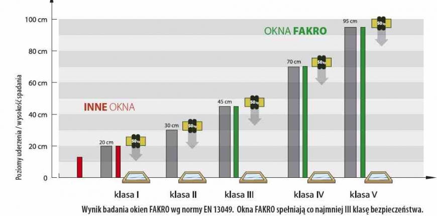 wysokiej jakości, trwałe i bezpieczne okna dachowe. Jako pierwsza wprowadziła na rynek min. okna standardowo wyposażone w szybę hartowaną, która objęta jest bezterminową gwarancją na rozbicie przez grad. Co więcej, konstrukcja okna jest specjalnie wzmocniona dzięki czemu wszystkie okna FAKRO jako jedyne posiadają III klasę bezpieczeństwa dla całego okna łącznie z szybą wg normy EN 13049. Okna dachowego FAKRO nie da się w łatwy sposób otworzyć, np. poprzez dynamiczne naciśnięcie nogą na górną, zewnętrzną część okna. Nie spowoduje to otwarcia skrzydła bądź wyrwania zawiasów. Kominiarz lub osoba z ekipy remontującej dach nie wpadnie przez okno, jeżeli przypadkowo nadepnie na skrzydło. Daje to gwarancję bezpiecznego użytkowania budynku.