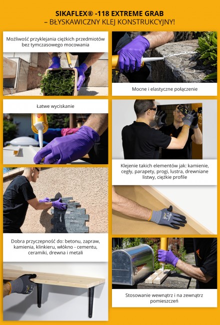 Sikaflex®-118 Extreme Grab stosuje się wewnątrz i na zewnątrz. Dzięki niemu można łączyć ze sobą wiele różnych rodzajów materiałów, jak beton, większość kamieni, ceramika, drewno, metale, szkło. Tym samym świetnie nadaje się do montażu okładzin ściennych, parapetów, luster czy profili lub listew. Jednym z jego najważniejszych parametrów jest bardzo wysoka przyczepność początkowa, dzięki której przyklejanie ciężkich przedmiotów prowadzi się bez konieczności zastosowania mocowań tymczasowych (za wyjątkiem sufitów, gdzie mocowania zawsze są potrzebne).