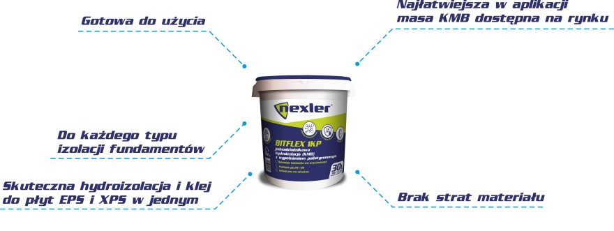 Nexler BITFLEX 1KP doskonale sprawdza się jako zabezpieczenie inwestycji przed wilgocią. Jest to jednoskładnikowa masa hydroizolacyjna KMB przeznaczona do izolacji ścian fundamentowych oraz piwnicznych. Sprawdza się również przy klejeniu płyt ocieplających do fundamentu.