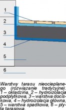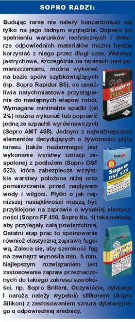 To rozwiązanie jest spotykane w konstrukcjach tradycyjnych. Warstwy te nie są konieczne, jeśli stosuje się uszczelnienie alternatywne, które umożliwia mocowanie okładziny bezpośrednio do niego. Warstwa dociskowa, o grubości 4-5 cm (jednakowej na całej powierzchni tarasu), stanowi podłoże pod okładzinę. Przenosi obciążenia użytkowe z nawierzchni tarasu i chroni warstwy znajdujące się niżej. Wykonuje się ją w technologii jastrychu pływającego z betonu B 15 wzmocnionego siatką przeciwprężną lub z zaprawy cementowej, pamiętając o przeniesieniu również na tę warstwę dylatacji. Jeśli powierzchnia tarasu jest duża, lepiej zamiast układania siatki wykonać zbrojenie z prętów stalowych układanych na krzyż. Na warstwie dociskowej wykonuje się hydroizolację podpłytkową - po uprzednim zagruntowaniu podłoża - z płynnych folii poliuretanowych oraz szlamów mineralnych. Układa się ją w dwóch warstwach, nanosząc preparat pędzlem, pacą lub szczotką w odstępie 4-8 godzin. Hydroizolacji nie można nanosić podczas deszczu i silnego nasłonecznienia, później zaś należy chronić ją przed czynnikami atmosferycznymi przez około dobę. Dostępne są także systemy uszczelnień w postaci płynnej folii wraz z niezbędnymi taśmami, narożnikami i mankietami uszczelniającymi. Hydroizolację podpłytkową trzeba wyprowadzić na pionowe płaszczyzny konstrukcji, aby zabezpieczała przed zawilgoceniem główną hydr izolację. Po wykonaniu wszystkich warstw tarasu można przyklejać okładzinę.