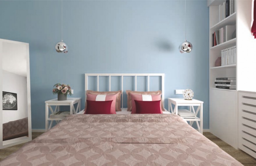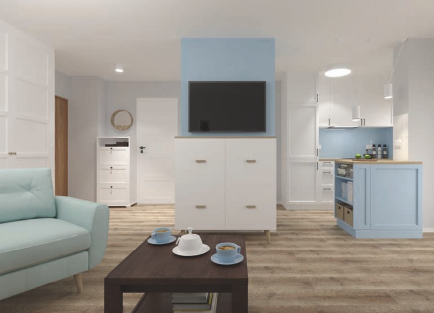 Patrząc na wizualizację mieszkania, trudno oprzeć się wrażeniu, że mamy do czynienia z pięknym nowym apartamentem. Aranżacja jest spójna i wyważona, przestrzeń jasna i obszerna. Stało się tak również dzięki fachowej wiedzy projektantki. Pozostałości po wyburzaniu ścian – szachty instalacyjne, podciągi i wnęki – zostały umiejętnie wkomponowane w zabudowę. Przykładem może być „słup” kryjący przewody instalacyjne, który znalazł się w centralnym miejscu strefy dziennej. Od strony pokoju stał się on doskonałym punktem oparcia dla strefy telewizyjnej, a od strony wejścia do sypialni do umieszczenia regału z książkami. W sypialni pod oknem półki wynikające z konstrukcji budynku umiejętnie połączono z zabudową grzejnika. Kuchenna wyspa to nie tylko dodatkowy blat, ale też wytrawna dekoracja wnętrza!
