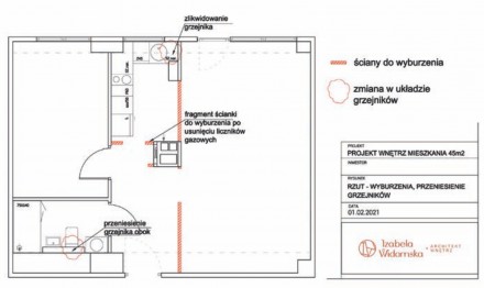 W przypadku generalnego remontu zaangażowanie fachowca może być niezbędne już na starcie. Jakikolwiek zamiar wyburzenia ścian musi być zgłoszony do spółdzielni mieszkaniowej. W tym przypadku było dużo ścian konstrukcyjnych, dlatego konieczne stało się złożenie szczegółowego projektu, ukazującego, które ściany będą zastąpione podciągami. Na składanym projekcie architektka musiała uwzględnić również zmiany instalacyjne, np. przeniesienie grzejników w kuchni i łazience. Dopiero po uzyskaniu zgody spółdzielni na ingerencję w konstrukcję i instalacje w budynku można było przystąpić do sporządzenia planu remontu.